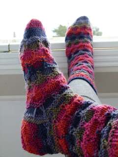 Ja tälläiset normisukat (tai peruspertit) sain tehtyä myös miehelleni, olen nimittäin joutunut jonkin verran parsimaan jo mieheni villasukkia (hän on varsinainen sukankuluttaja). Lankana näissä sukissa on Dream of Vienna thanks (ei kykene, ei edes voi kirjoittaa tätä langan nimeä, etteikö rupeaisi vähän naurattamaan..). Mies valitteli myös viime viikonloppuna, että hänelle tekemäni huovutetut tohvelit alkavat mennä puhki :I Ei kai siinä..hyvä kun tulee pidettyä. Täytynee tehdä uudet huovutetut tohvelit hänelle, vaikka sitten syksymmällä.