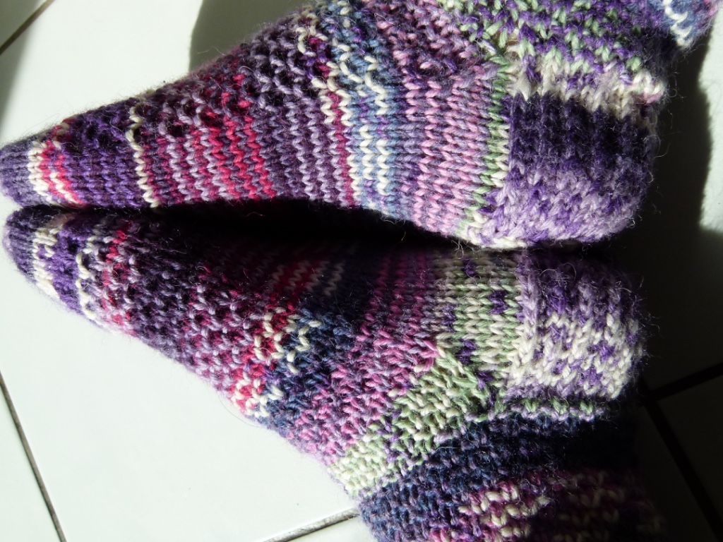 Vielä sen verran sukista, että lankoina oli seiskaveikan jämiä (violetit) ja toisissa nallea ja jotain omavärjäämiä lankoja. Nyttöset joko pienenivät tai hävisivät kokonaan näihin tekeleisiin.